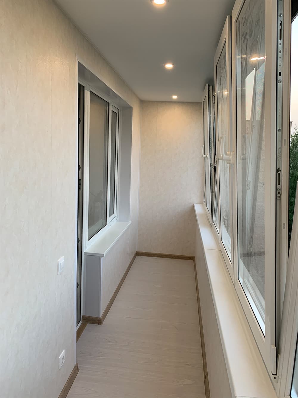 Выполненные работы: Демонтаж старых окон, Остекление лоджии профилем REHAU Intelio 80, Утепление и отделка балкона, Проводка электрики и теплого пола, Установка шкафов